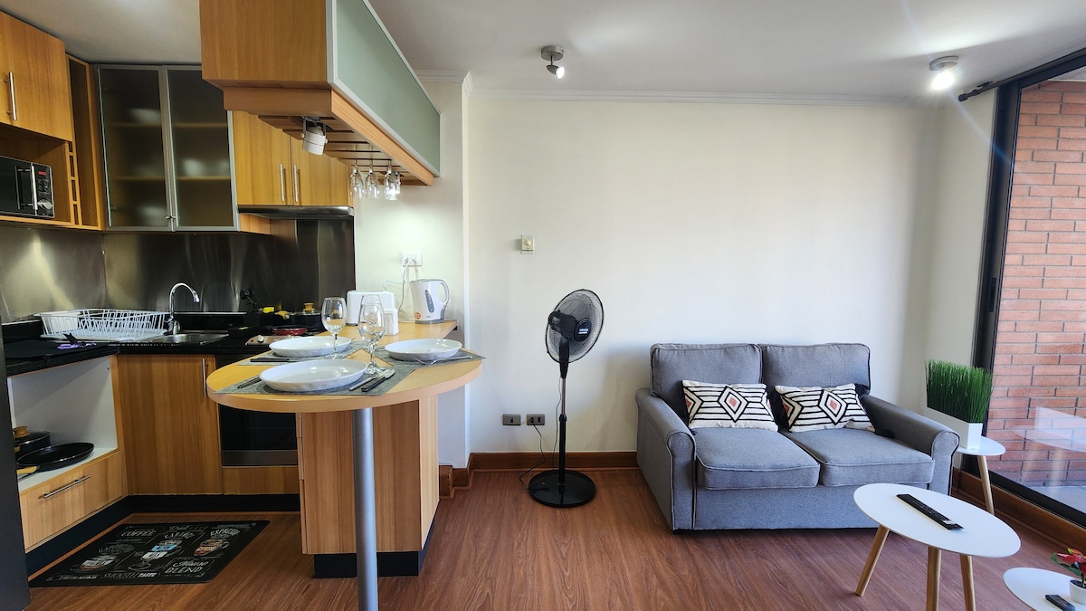 Enjoy a great experience in this save location in Barrio El Golf. Modern and cozy apartment with a privileged location, in the heart of gourmet cuisine and luxury shops of Santiago de Chile "Barrio El Golf". The neighborhood is characterized by its great architectural value and its attractive and varied cultural, gastronomic, and recreational offer. (restaurants, cafes, bars, theaters, museums, design galleries, etc). A few meters away is the metro station ¨Escuela Militar¨ and Plaza Peru.