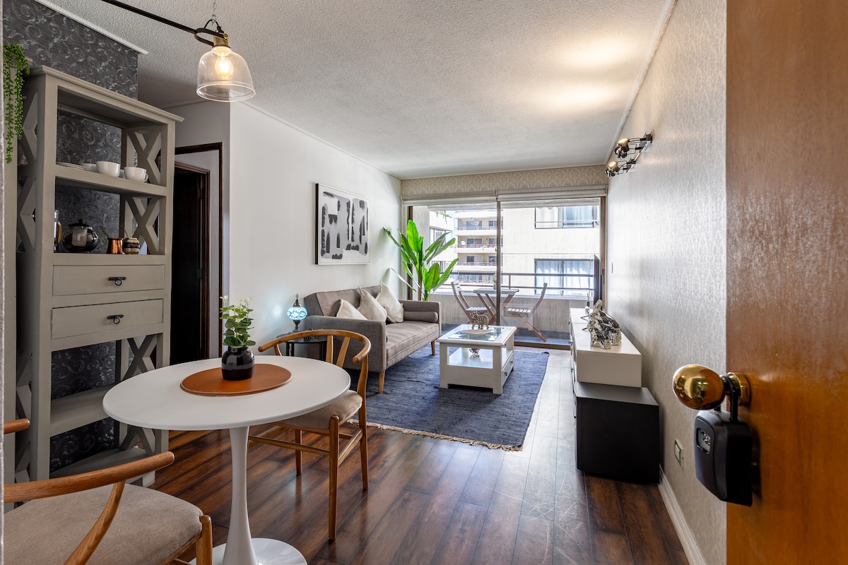 Enjoy a great experience in this save location in Barrio El Golf. Modern and cozy apartment with a privileged location, in the heart of gourmet cuisine and luxury shops of Santiago de Chile "Barrio El Golf". The neighborhood is characterized by its great architectural value and its attractive and varied cultural, gastronomic, and recreational offer. (restaurants, cafes, bars, theaters, museums, design galleries, etc). A few meters away is the metro station ¨Escuela Militar¨ and Plaza Peru.