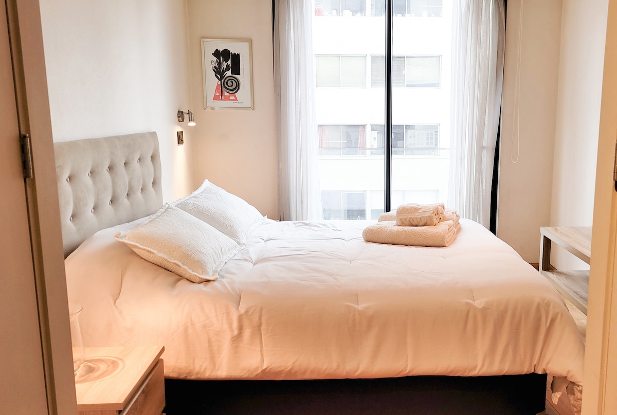 Enjoy a great experience in this save location in Barrio El Golf. Modern and cozy apartment with a privileged location, in the heart of gourmet cuisine and luxury shops of Santiago de Chile "Barrio El Golf". The neighborhood is characterized by its great architectural value and its attractive and varied cultural, gastronomic, and recreational offer. (restaurants, cafes, bars, theaters, museums, design galleries, etc). A few meters away is the metro station ¨Escuela Militar¨ and Plaza Peru.