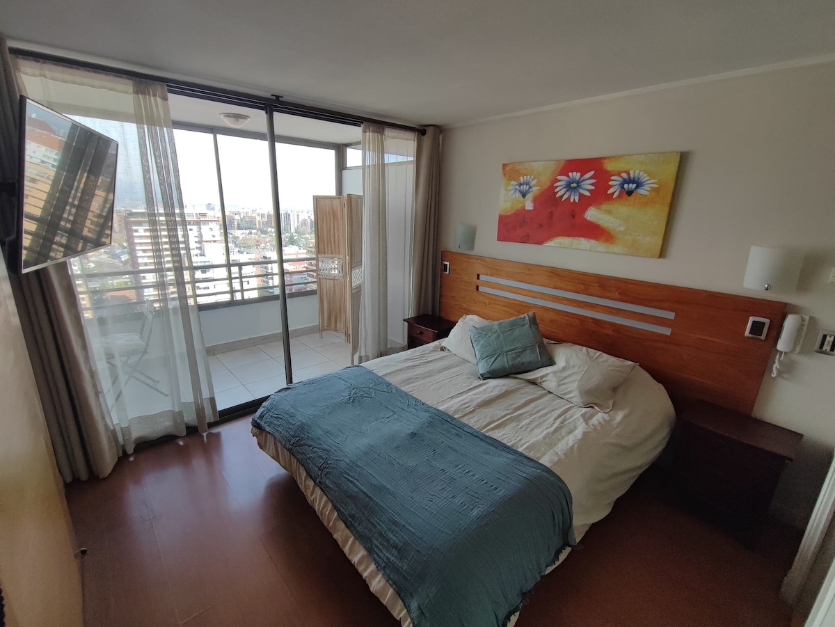 Acogedor depto. para 2 en la mejor zona de Las Condes (El Golf). A pasos del Metro, restaurantes, cafés y centros comerciales. Ubicado en Apoquindo, disfrutarás de una conectividad y seguridad insuperables. Perfecto para explorar lo mejor de Santiago con todas las comodidades a tu alcance. ¡Tu base ideal en la ciudad te espera!