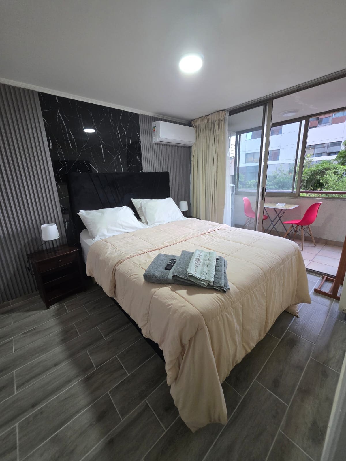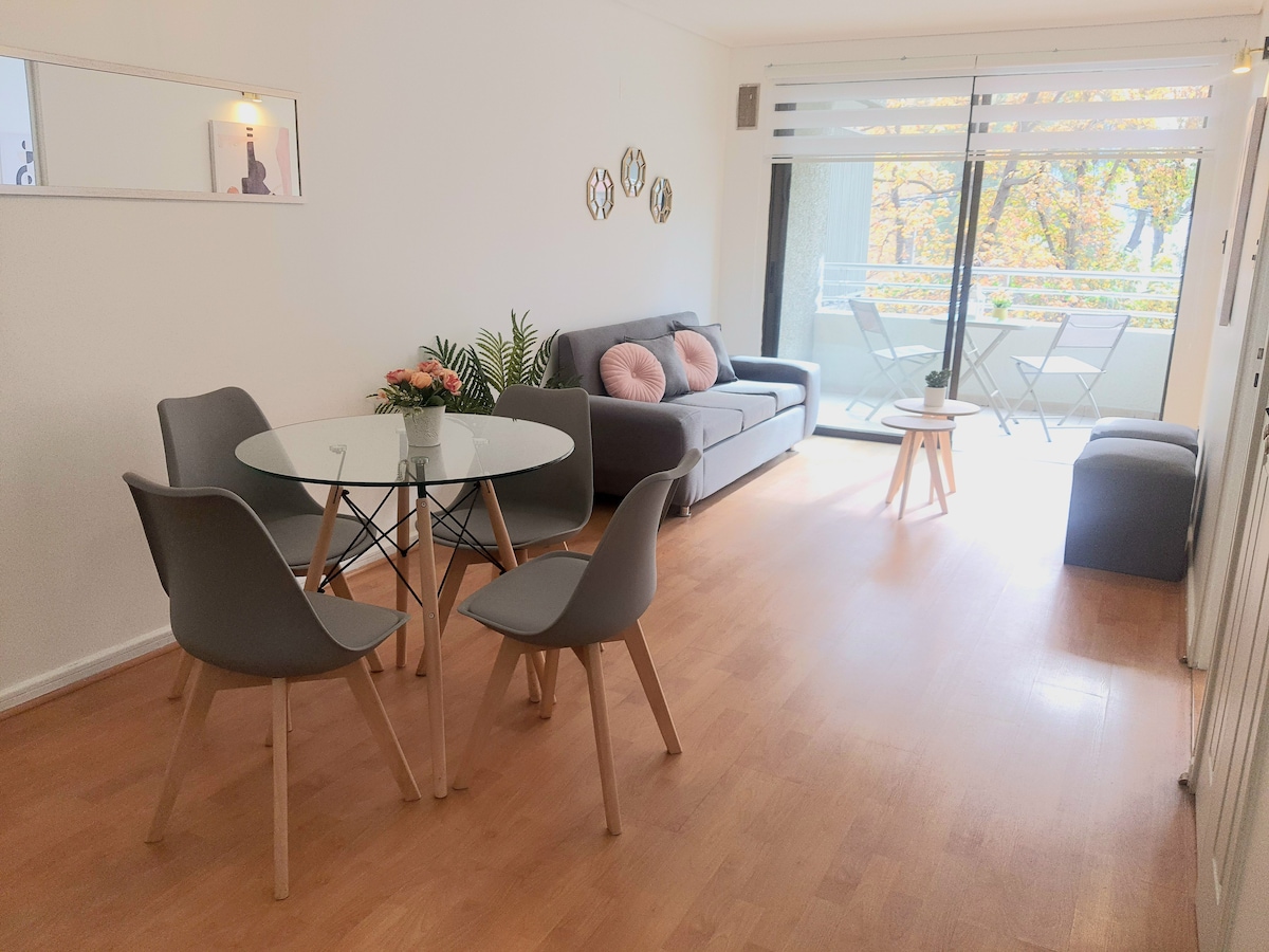 Beautiful and comfortable studio apartment steps away from Parque Arauco and Clínica Alemana. Enjoy a cozy and comfortable stay in Las Condes. Our Hosts are 1 click away! -Surrounded by cafes, restaurants and luxury shops -Comfortable King bed and 2-seater sofa bed -Kitchen fully equiped -High speed internet -Outdoor and indoor heated pool -Gym -Security and controlled access Ideal for: Business or pleasure People looking for a safe and quiet location