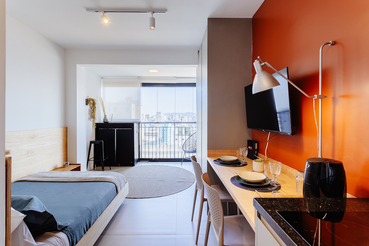 Estúdio espaçoso com muito design, arquitetura e a melhor vista de São Paulo. Loft completo! Com cama queen, closet, ar condicionado silencioso, cozinha completa, home office, WI-FI, TV 55” e uma belíssima banheira de imersão, de onde pode apreciar o seu drink preferido e curtir uma vista apaixonante. São Paulo toda estará há poucos minutos de você. Acesse o metrô andando apenas 200m. Reserve com tranquilidade! Proporcionaremos uma excelente hospedagem e uma ótima experiência!