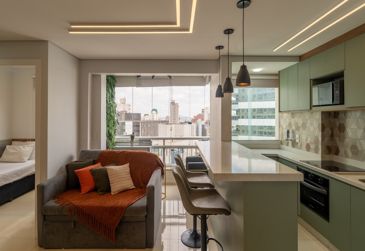 Brand new apartment, with a contemporary style, of a high standard and very well located, with a privileged view of Allianz Parque. Next to shopping malls, various businesses, means of transport, parks, tourist attractions and business buildings. The studio is complete, with a comfortable queen bed, Smart TV and Internet. Kitchen with all utensils, cooktop, refrigerator and microwave. With parking (rotary). Close to everything, cozy, perfect for experiencing fantastic moments.