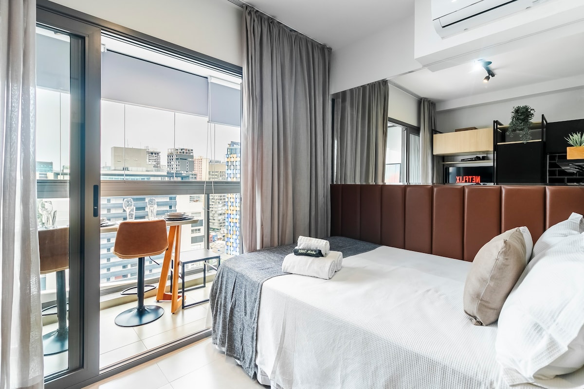 Experience One Eleven in Vila Olimpia. This modern apartment features large windows with breathtaking city views and natural light. The unit boasts 600 Mbps internet and a 4K HD TV. For total comfort, it has a Hot/Cold AC system: 27,000 BTU/h unit in the living room and 10,000 BTU/h in the bedroom. The bedroom is quiet and dark for a restful sleep. Impeccably maintained, you’ll be walking distance to top restaurants and business hubs—a safe, upscale retreat with a stunning urban backdrop.