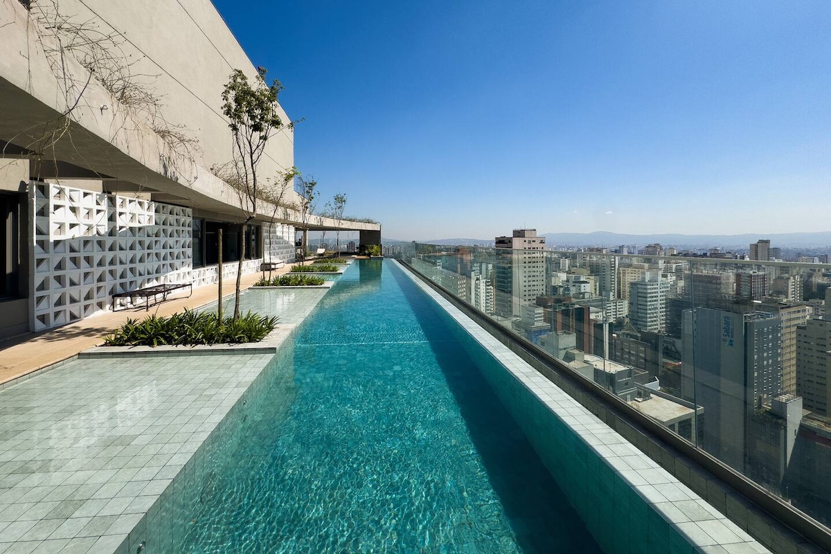 Work and relax with a 180° panoramic view on the 21st floor, just meters from Av. Paulista and Higienópolis-Mackenzie subway. Modern studio with air conditioning, ultra-fast Wi-Fi (461 Mbps), a comfortable workspace, and self check-in with a smart lock. In the building, enjoy a suspended Olympic pool, fully equipped gym, dry and steam saunas, laundry, and free parking.