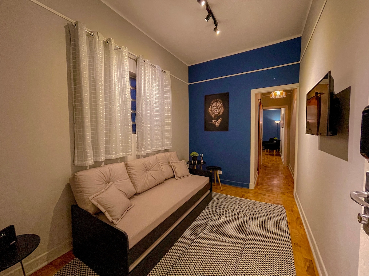 Uma casinha disfarçada de apartamento, super fofo, estilo retrô, mantendo características originais, porém atualizado para receber nossos hóspedes com conforto e praticidade. Um local único e charmoso, com quintal e churrasqueira. Localizado no coração de São Paulo, estamos a apenas alguns metros do metrô, em uma rua badalada, cheia de bares e restaurantes, mas totalmente silencioso e seguro, por estar longe da rua. Estamos no primeiro andar, e o acesso é feito por apenas 20 graus de escada.