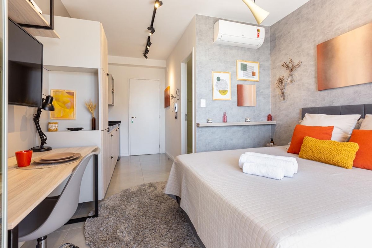 Studio Moderno Completo A apenas 2 quarteirões do Shopping Frei Caneca e 500 metros da estação Mackenzie-Higienópolis, este estúdio oferece conforto e praticidade. • Ar-Condicionado • Wi-Fi 250mb • Smart TV • Máquina lava e seca (uso gratuito) • Mesa de trabalho e cadeira confortável • Toalhas e roupas de cama inclusas • Cozinha completa: micro-ondas, cafeteira, forno e fogão • Ferro de passar e secador de cabelo Ideal para estadias curtas ou longas, próximo à Avenida Paulista.