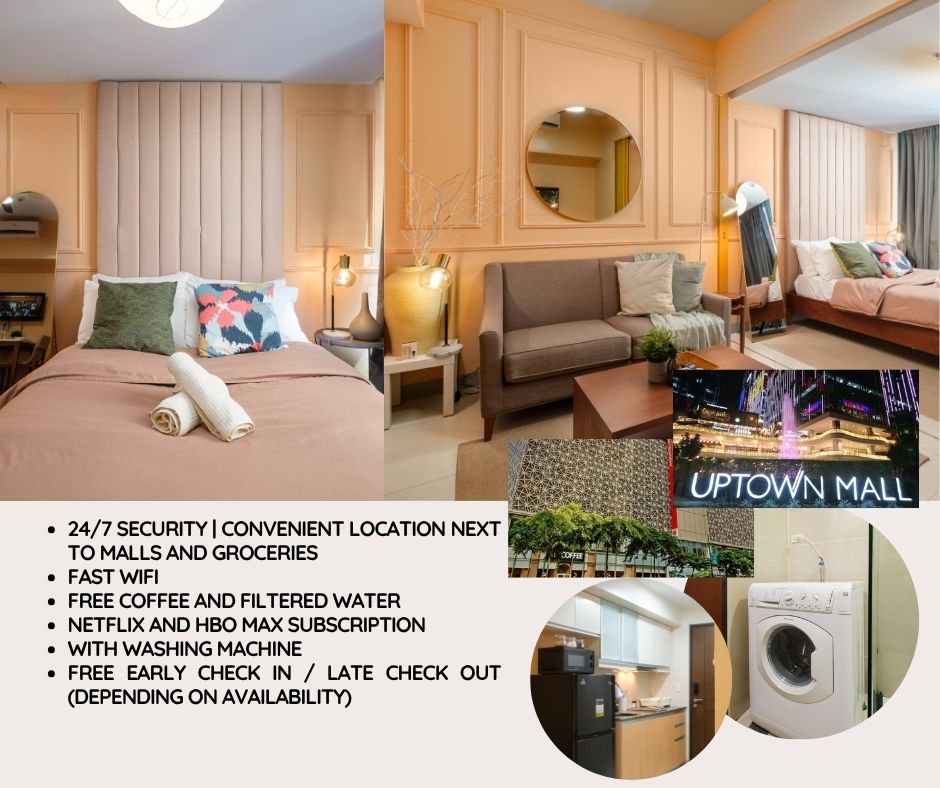 Book this luxury stay at the center of BGC. Everything is just a few steps away. Prime offices and high end malls surround Uptown Parksuites. Experience a cosmopolitan getaway at the Uptown Mall. Explore unique food and shopping concepts. Party the night away at premier bars right at your doorstep. Unwind in our Mid Century Modern bedroom unit. Comforts include a 55 inch SMART TV, 400 MBPS internet and a study area. Enjoy a comfortable and stylish experience at this centrally-located place.