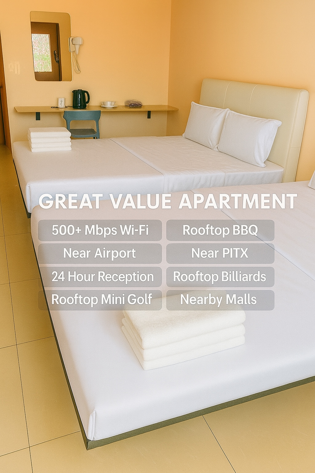 Standalone building with about 50 guest rooms, located very close to Manila Airport terminals. Surrounded by airline dorms and airport bus parking, it offers great convenience. The property features a private courtyard and 24/7 butler service, with 500+ Mbps high-speed internet throughout. Facilities include a rooftop billiard table, golf practice cage, BBQ area, and a small gym. Rooms are fully equipped with coffee, hair dryer, water heater, kettle, toiletries, plus shared kitchen and laundry.