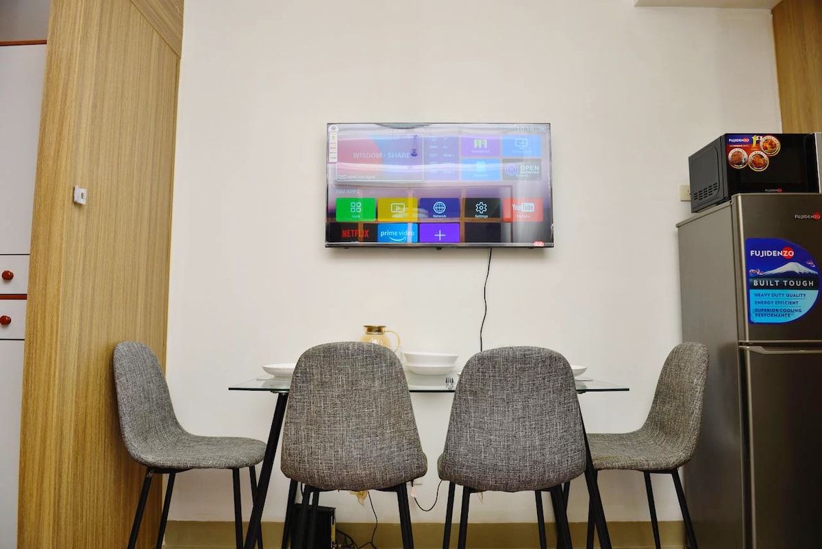 This place is a fusion of Japanese and Scandinavian design perfect for group of 6. It has 2br, 1 queen-sized bed, 1 convertible sofa bed, and a double deck. The living room has a 55-inch TV, board games like chess and Uno, and sungka. The fully-equipped kitchen provides home-like experience. It likewise has a bar table and a bar stool, and a balcony with a view of city lights. The condo unit has access to shared facilities (playground, pool, picnic area, paved jogging area), and sky lounge.