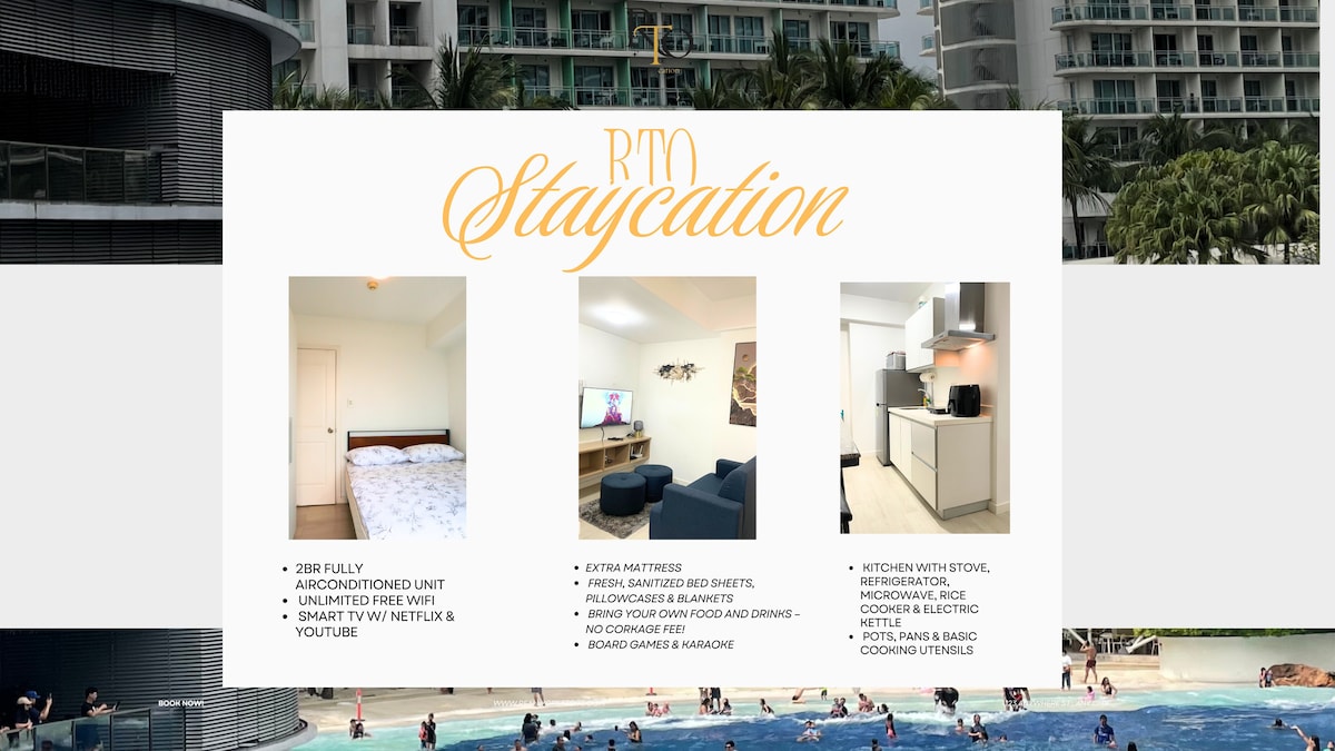 • Affordable resort stay at Azure Urban Residences with no hidden charges. • Access to the wave pool, beach area, and resort amenities (optional add-on). • Clean, cozy, and fully furnished units with Wi-Fi, Netflix, and air-conditioning. • Conveniently located near restaurants, malls, and NAIA airport. • Transparent booking process – what you see is what you pay.