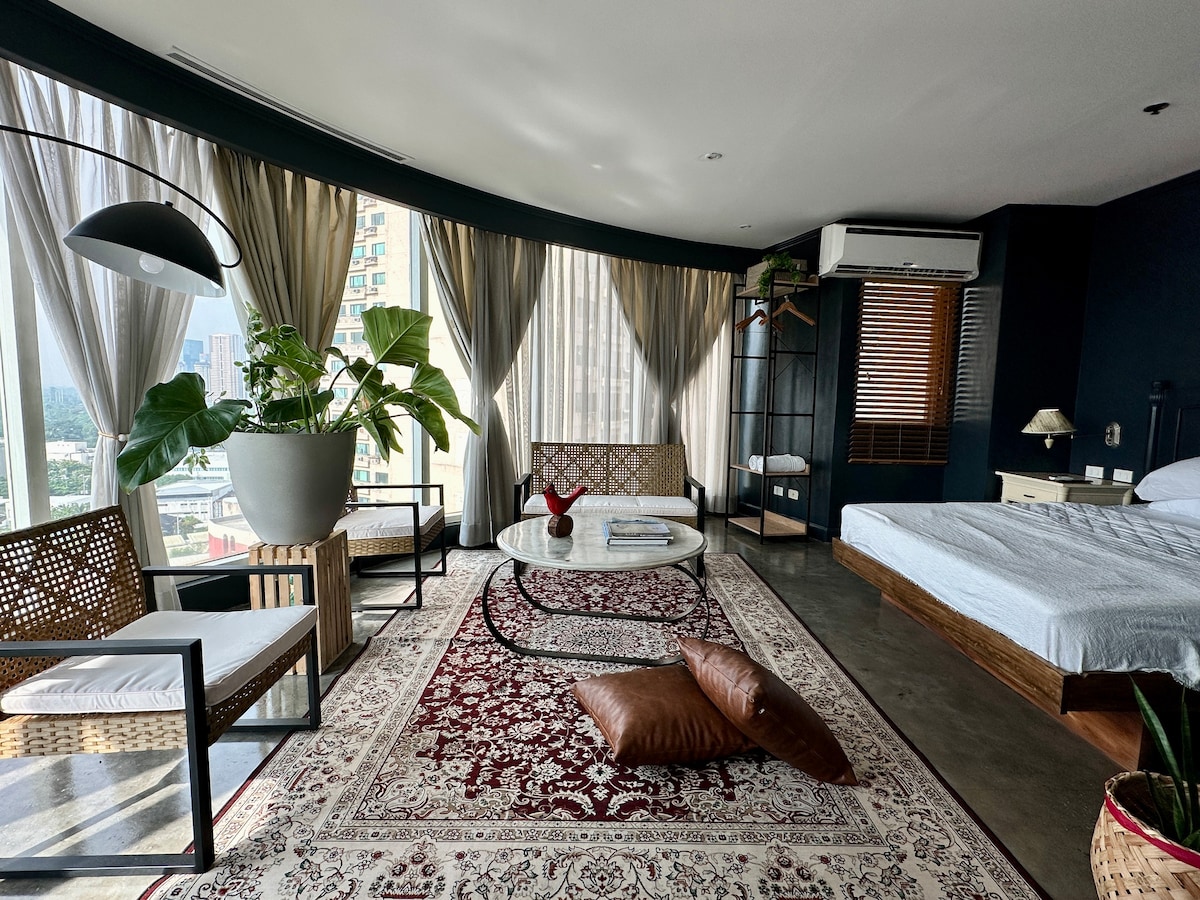 Open the complimentary wine and listen to music via retro Marshall speakers. Here custom wood furniture meets textured concrete walls, plush Persian carpets, classic vintage pieces and 60s pop art accents. A refined fusion of industrial and retro features ultimately lends this loft its unique, special character. Perfect for a photogenic boutique art hotel vibe. A fantastic option for business travel and couples with discerning taste, looking to stay in one of Manila’s most premium locations.