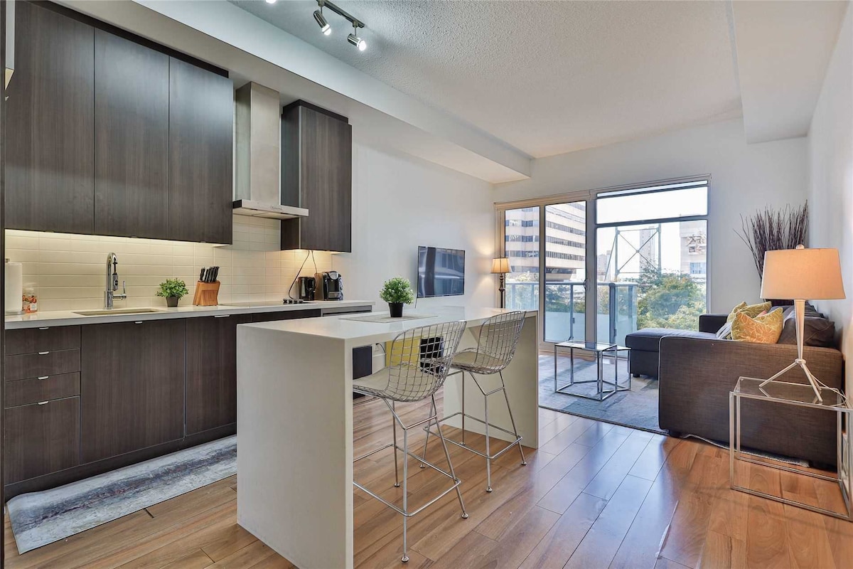 This boutique condo, in the heart of Toronto, is just steps from the city’s best restaurants, shops, bars, and live music venues. With easy access to Toronto’s Financial District, Discovery District/Hospital Row, AGO, Entertainment District, CN Tower, Ripley’s Aquarium, City Hall, home arenas for the Blue Jays, Leafs, and Raptors, everything you need is within reach. Ideal for business trips, relocations, couples getaways, or family vacations, this suite comfortably accommodates up to 4 guests.