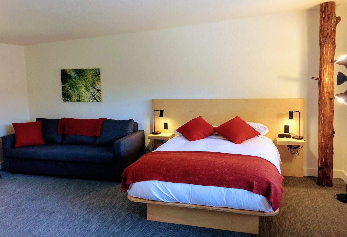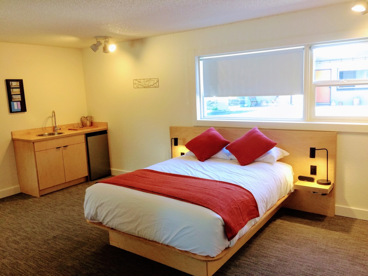 Heliotrope means "turn towards the sun" and our Maple room is located in a south-facing row, bathing it in natural light. This queen suite is 205 square feet & features a custom built queen bed & cabinetry by Smith & Vallee Woodworks, modern tiled bath, tree coat rack, original local art, 32" HDTV, & mini fridge. With careful craftsmanship, and attention to design detail, the Maple room offers a unique sense of PNW place and space.