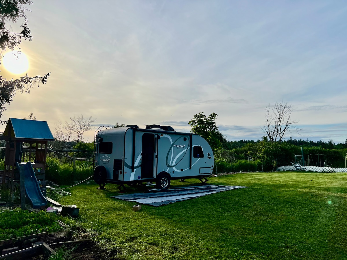 You won’t forget your time in this romantic, memorable place! Right beside a garden. Take a breath of a morning sun in the heart of South Surrey Farmland. RV offers: - Queen bed - high-end memory foam mattress - small table - full Kitchen and utensils - wifi - shower with hot water, and - outdoor seatings Please check out the photo tour for details. No air conditioner or TV though, even if they are attached to the RV. 3 guests Max, and please kindly choose the correct number of guests.