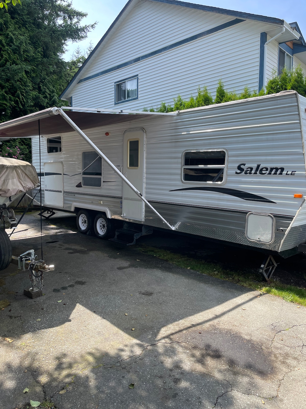 Camping with convenience! You will love our quiet neighbourhood as much as we do. The RV is stocked with essentials, and sits on a concrete pad which hosts an outdoor dining area and BBQ. The kitchen is stocked with dishes, cookware and basic spices. It's walking distance to the village: shopping, multiple cafes, eateries, playgrounds and parks, and an easy drive (or bus) to beaches, mountains, and city-life. We will be around and easy to contact if you need us. The RV is parked beside our home!