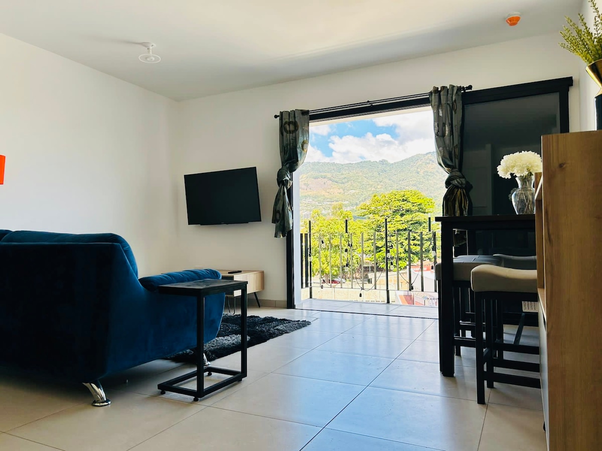 Apartamento nuevo, totalmente equipado y amueblado con una sola cama matrimonial, con decoración moderna pensado en garantizarte una cómoda y agradable estadía. Ideal para relajarte, disfruta de tu café por la mañana en la terraza con una gran vista a la ciudad o disfruta una copa de vino en la noche con la excelente vista a San Salvador. En una zona céntrica, estratégica y segura, cerca de supermercados, centros comerciales. A solo 40 minutos del Aeropuerto,