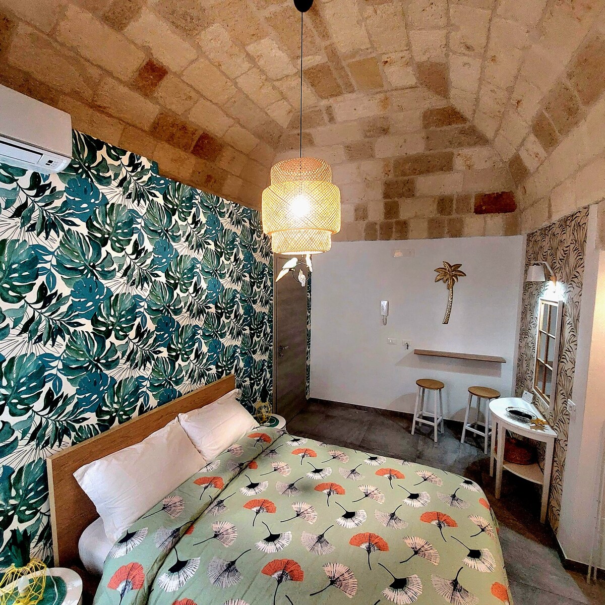 Suite Tropical | Center Near Train · Large Shower (Piano 1) Camera indipendente al primo piano, ideale per giovani coppie. Dotata di angolo cottura completo con accessori, aria condizionata, Wi-Fi gratuito e doccia spaziosa con finestra. Tema tropicale con verde e foglio oro, carta da parati stile tropicale. Parcheggi gratuiti vicini (max 10 min a piedi). Consigliata per soggiorni di 4-7 notti, perfetta per vacanze più lunghe in centro.