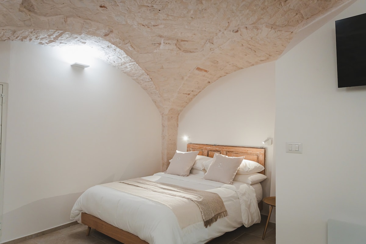 Vivi questo spazio incredibile, ricco di storia, situato in un contesto pittoresco. Al centro di un borgo di mare lontano dal turismo di massa. Pietra bianca naturale tutta intorno alla stanza e per terra la tipica “chianca” (temine medioevale che significa lastra di pietra) antica e originale. Ho cercato di lasciare il tutto più originale e rustico possibile per dare la sensazione agli ospiti di rivivere i tempi antichi in cui in questa camera ci viveva un’intera famiglia di 10 persone.