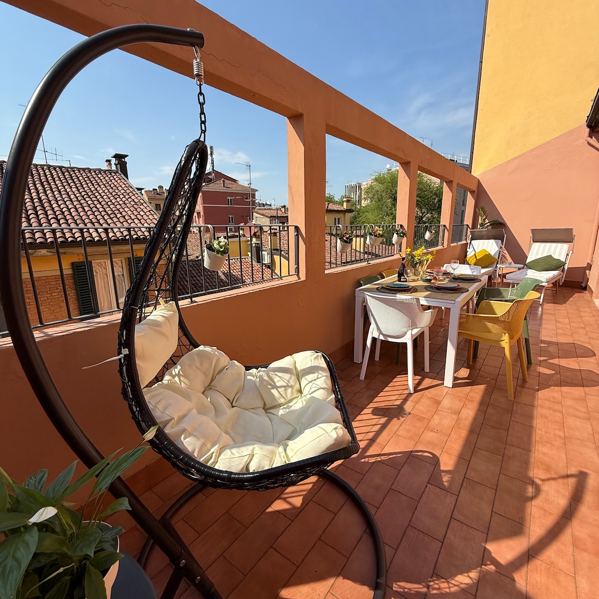 ◦ Lovely, bright and super quiet attic with a gorgeous view of the city ◦ Clean and comfortable, ideal for a delightful stay in Bologna ◦ Very central location. The perfect spot to explore the city centre by walk Equipped with all the comforts you need for a pleasant stay: 1 double bed Patio where you can have breakfast and meals Powerful Wi-fi A/C Spacious Table where you can work/study Bathroom with shower Warm hardwood parquet Windows on quiet internal court