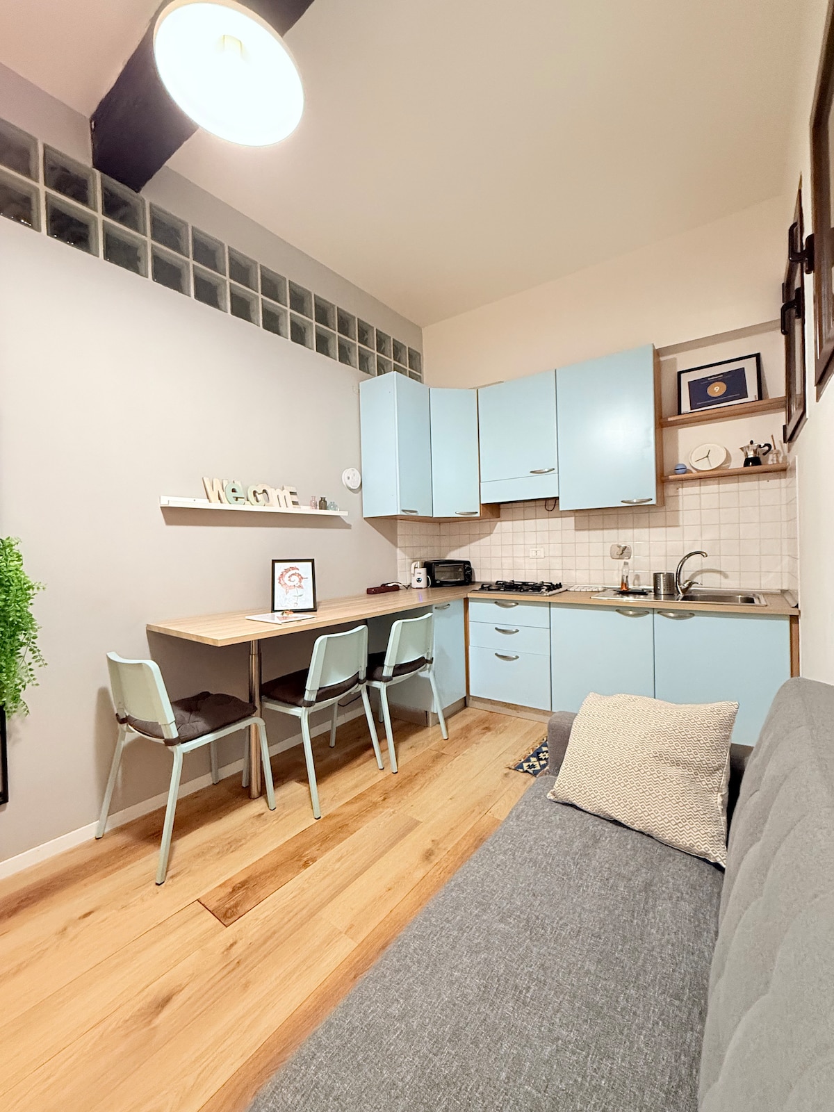 Elegant, completely renovated apartment above the famous porticoes of Bologna, recently appointed World Heritage by UNESCO. The space includes a large bathroom and an open-space area with a fully equipped kitchen and a living area with a comfortable bed for two people. During the restoration, frescoes dating back to the 19th century were discovered and are now enhanced by a sophisticated lighting system. The refined décor recalls the Rococo opulence and avant-garde of the 1970s.