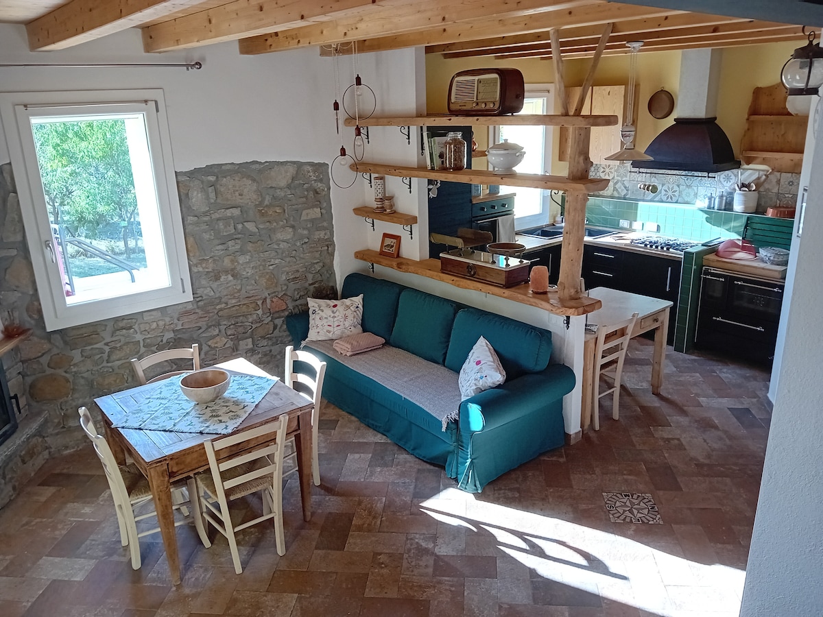 Piccola casa indipendente con ampio spazio all'aperto e uliveto adiacente. Piccolo bagno dotato di doccia e finestrato. Mansarda con letto matrimoniale e occorrente per rilassarsi all'esterno (ombrellone e sdrai). Divano letto e condizionatore. La casa dispone di un angolo cottura comprensivo di forno, frigo, microonde e piastra elettrica. In casa é presente un camino. Esternamente c'è uno spazio dedicato alla cottura in forno a legna e uno spazio per il barbecue.
