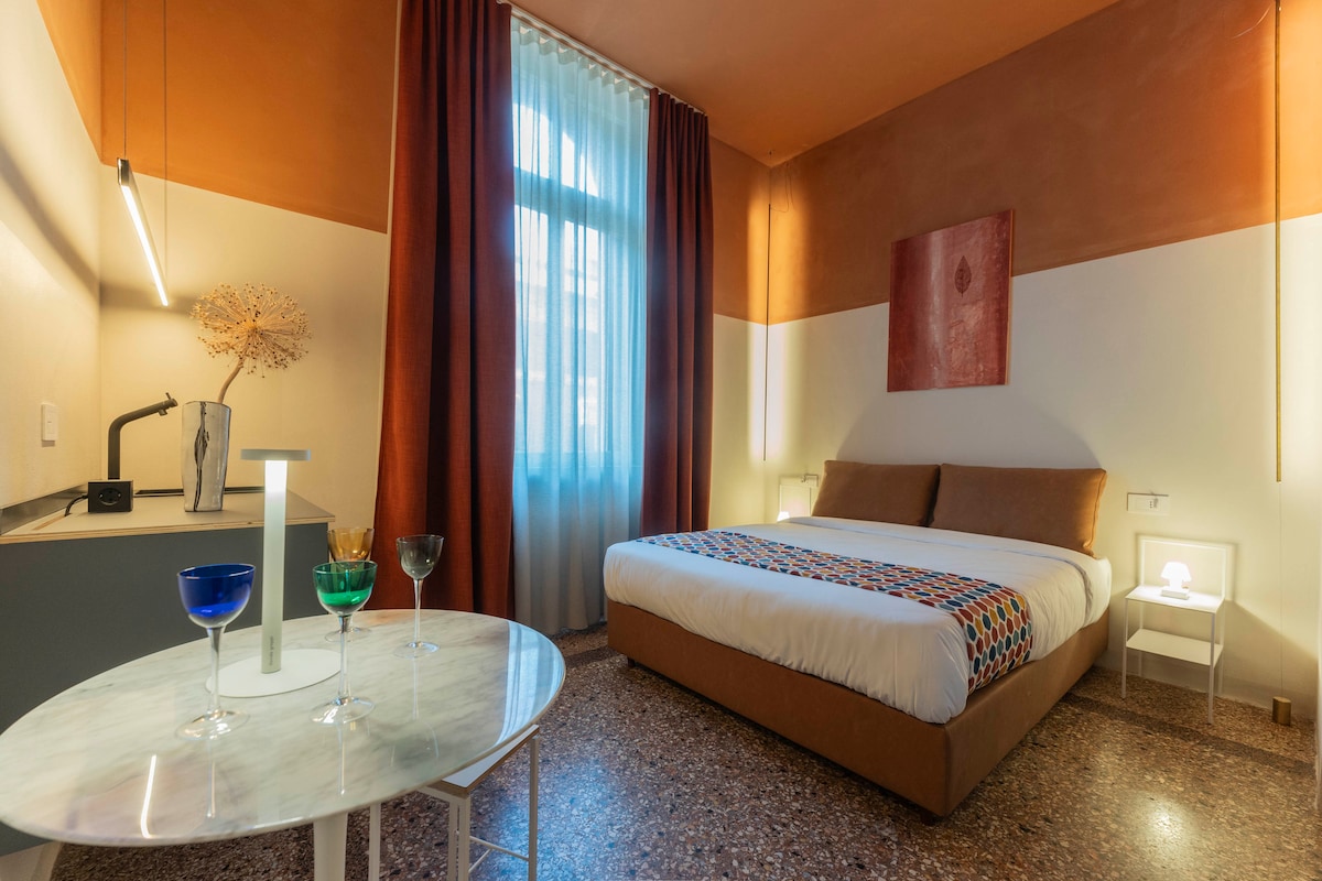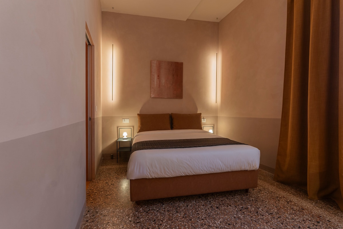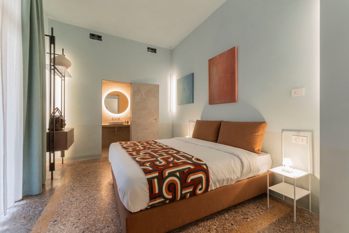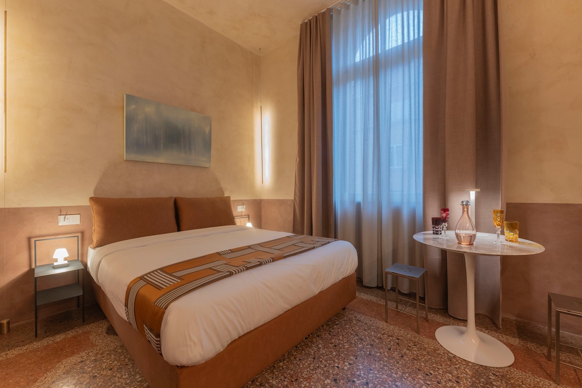 Studio 306 in Palazzo Archimede offers a private terrace in the historic center: a rare outdoor space in Bologna, perfect for an outdoor break after the city. The interior includes a picnic kitchen (kettle, mini-fridge, coffee machine) ideal for quick preparations, a dining table and a double bed, distributed with intelligence to maximize comfort and functionality. The space is easy to interpret and live in, perfect for a short vacation.