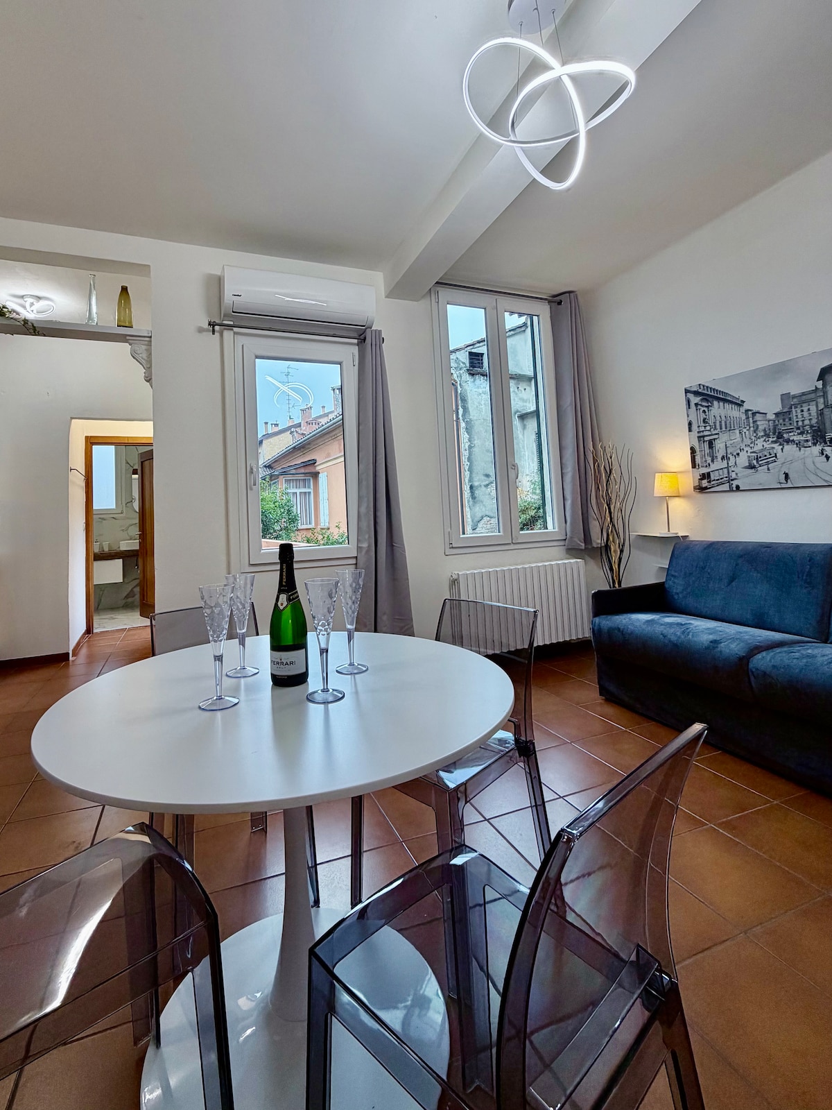 Spacious and elegant apartment in the heart of Bologna, located in a historic and refined building. Its central location lets you dive into the city's vibrant cultural and gastronomic scene. The apartment features 2 double bedrooms, a modern bathroom, a fully equipped kitchen, and a large living area with a 55-inch Smart TV and a piano. Strategically located, just steps from the iconic Two Towers, Piazza Maggiore, and the University of Bologna, it’s the perfect base to explore the city.