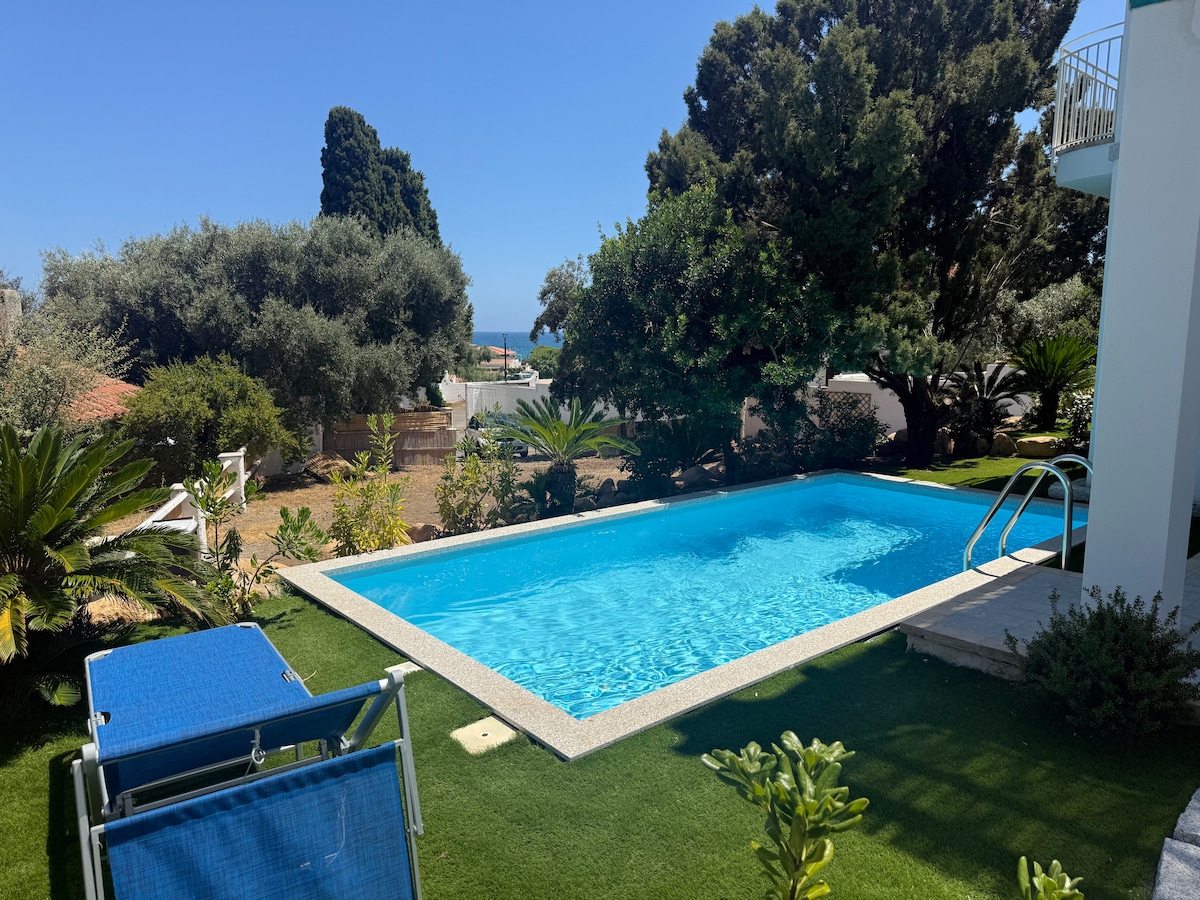Welcome to our Villa just 20min from the airport and only 3min walk from the beach. The space includes 3bathroom with shower, 3 bedrooms with A/C and flat tv in every room. We offer a fully equipped kitchen, a spacious living room and a seaview terrace where you can enjoy your morning coffee and relax with stunning sunset everyday. In the garden we have a big private pool (6×12mt), a BBQ, toys for kids, parking area. At the graundfloor there is a playroom. Make your stay unforgettable!