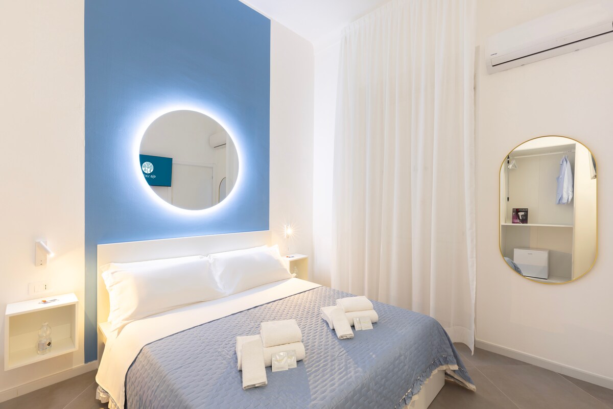 Since ancient times, the cult of water has been at the basis of the development of ancient civilisations. At Aqua Comfort Rooms, located in Via Tiziano in Cagliari, you can revive this cult, enjoying a relaxing stay in this room equipped with a hydro-massage bathtub next to the double bed, an en suite bathroom with a large shower and rain showerhead, a set of towels and a hairdryer, a 32-inch Smart TV, air conditioning, free Wi-Fi, a mini fridge and a coffee maker.