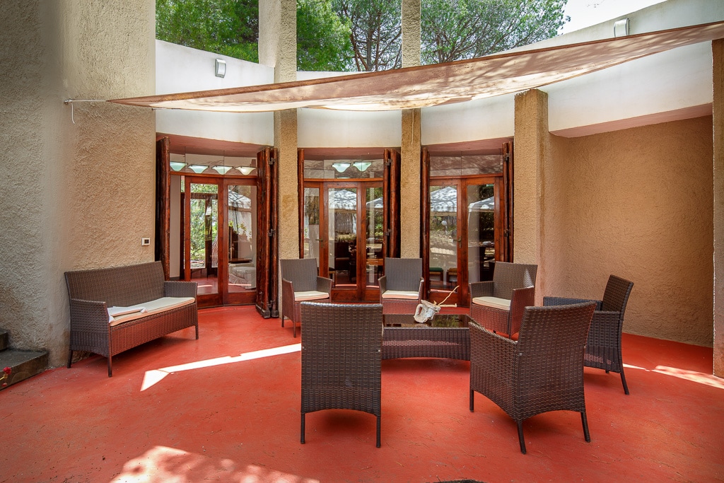 The villa is a Mediterranean style home on two levels, plus a separate building with a double bedroom and private bathroom. On the terrace there are a chill area and a dining area with typical stone barbecue, from there you can enjoy the view of the blue sea under the shade of pine trees. There is also a roofed beach terrace (directly on the beach), where you can relax under the shade, watch the beach and the sea, meditate, workout, or just enjoy a glass of wine