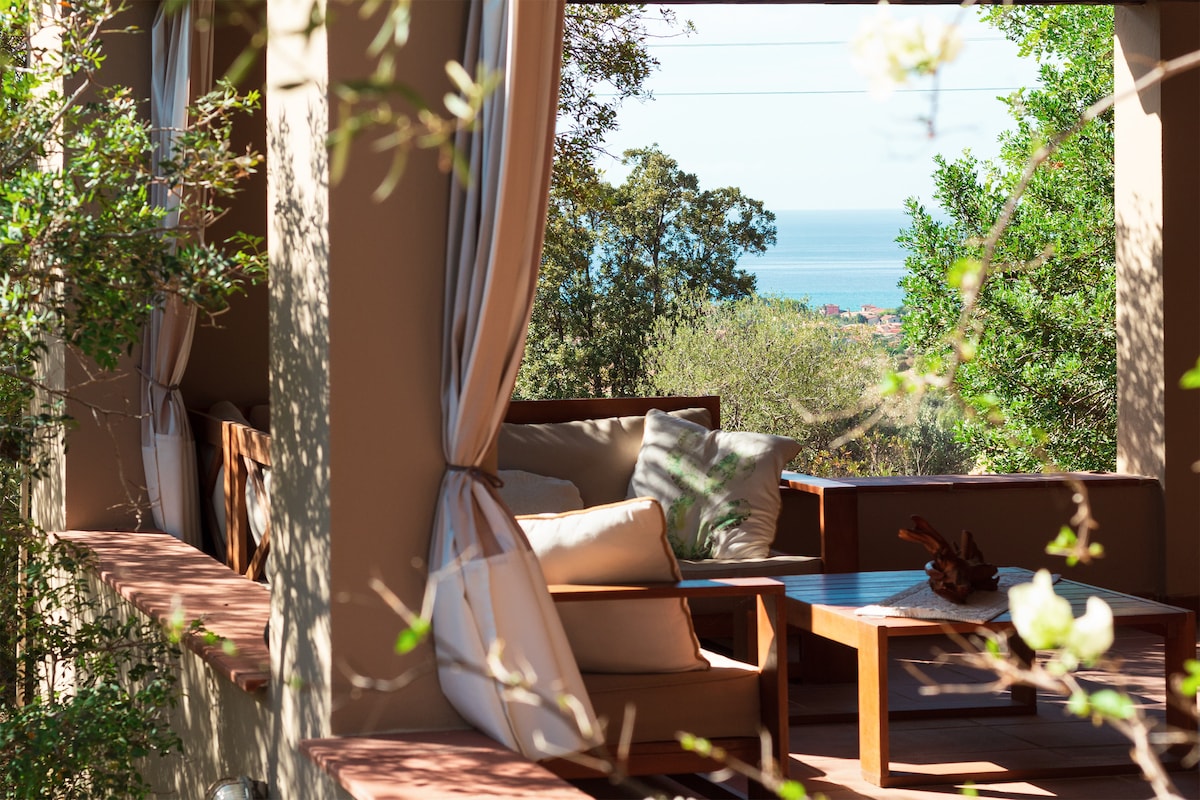 Appartamento con terrazza privata e vista panoramica sulle colline circostanti e sul mare. L'appartamento è dotato di zona living con angolo cottura, una camera da letto con letto matrimoniale, due divani e un bagno privato. Il B&B è situato in cima ad una collina, lontano dal rumore del traffico e delle città. Perfetto per stare in relax e godersi una rilassante vacanza. La colazione, compresa nel prezzo, viene servita ogni mattina nella veranda porticata.