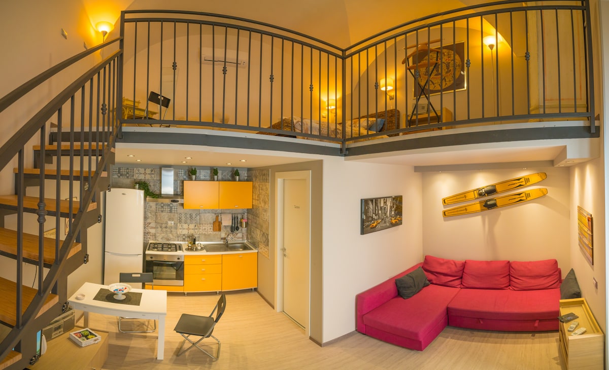 Enjoy unique views of Ursino Castle, Etna volcano, cathedral dome and sea from the panoramic terrace of my trendy loft apartment. The curated interior ambience is light, bright and features a mezzanine bedroom overlooking the living area. Just 150mt far from the typical and colourful fish market, 300mt from the Duomo square and 2km from the beach.