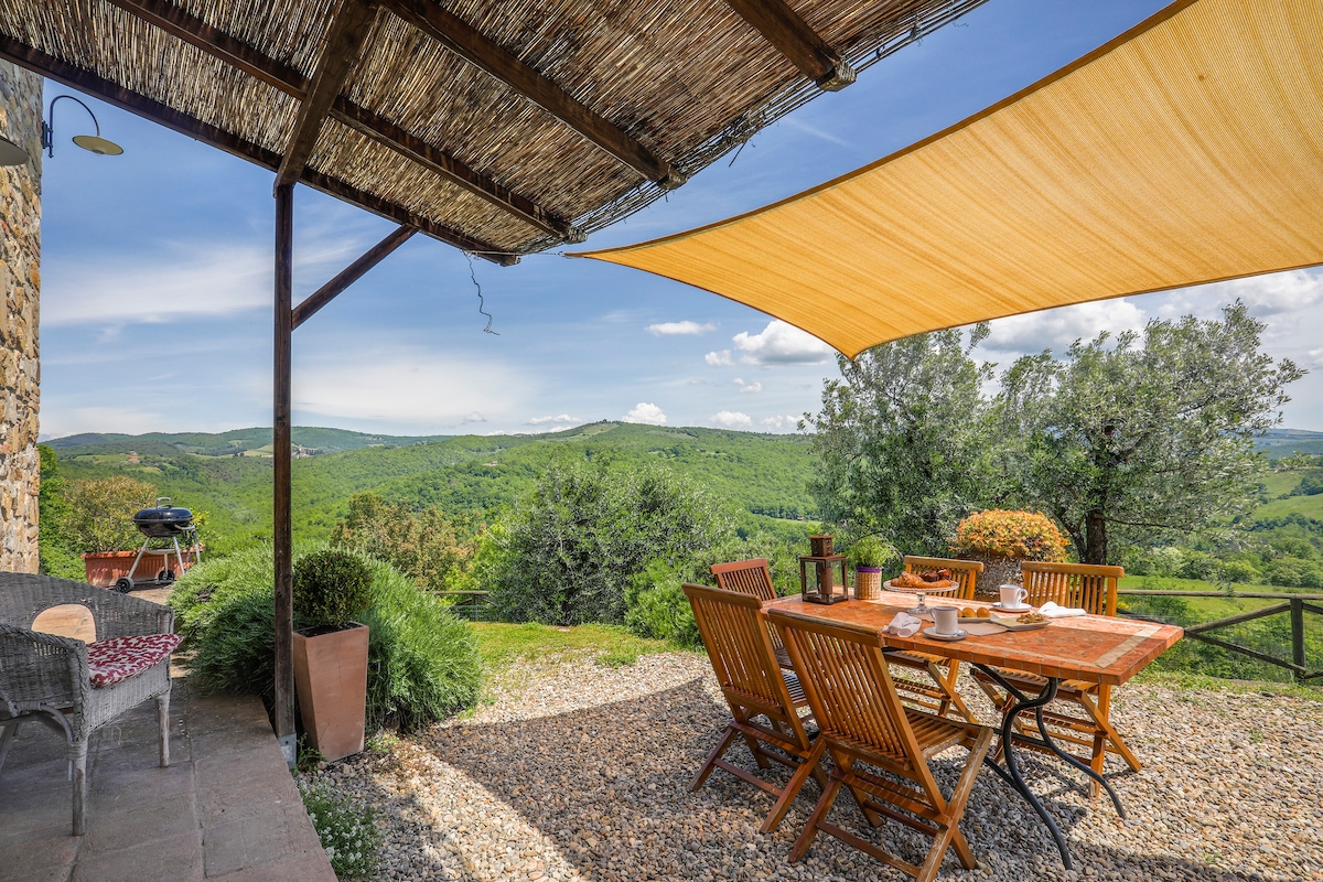 A charming stone home set within a private Chianti estate, surrounded by vineyards and olive groves. Ideal for couples or small families looking for peace, privacy and an authentic Chianti experience. Enjoy your private terrace, outdoor dining and easy access to Florence and top wineries. • One bedroom with a queen-size bed (160 cm) with direct access to the terrace • One twin bedroom