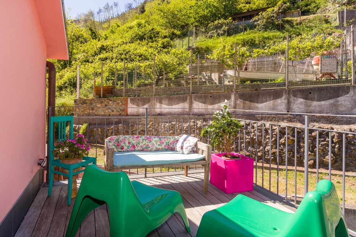 Incantevole appartamento privato a Recco, sito al piano superiore di una caratteristica casa rustica ristrutturata nel 2017. Parcheggio privato con accesso diretto al vialetto di ingresso; bagno con doccia; zona giorno ampia e luminosissima con divano letto, cucina e balcone con completa vista mare; piano superiore con camera da letto, armadio, scrivania e cassettiera. La casa dispone di un ampio terrazzo oltre che di un giardino. L'ingresso indipendente consente il distanziamento sociale.