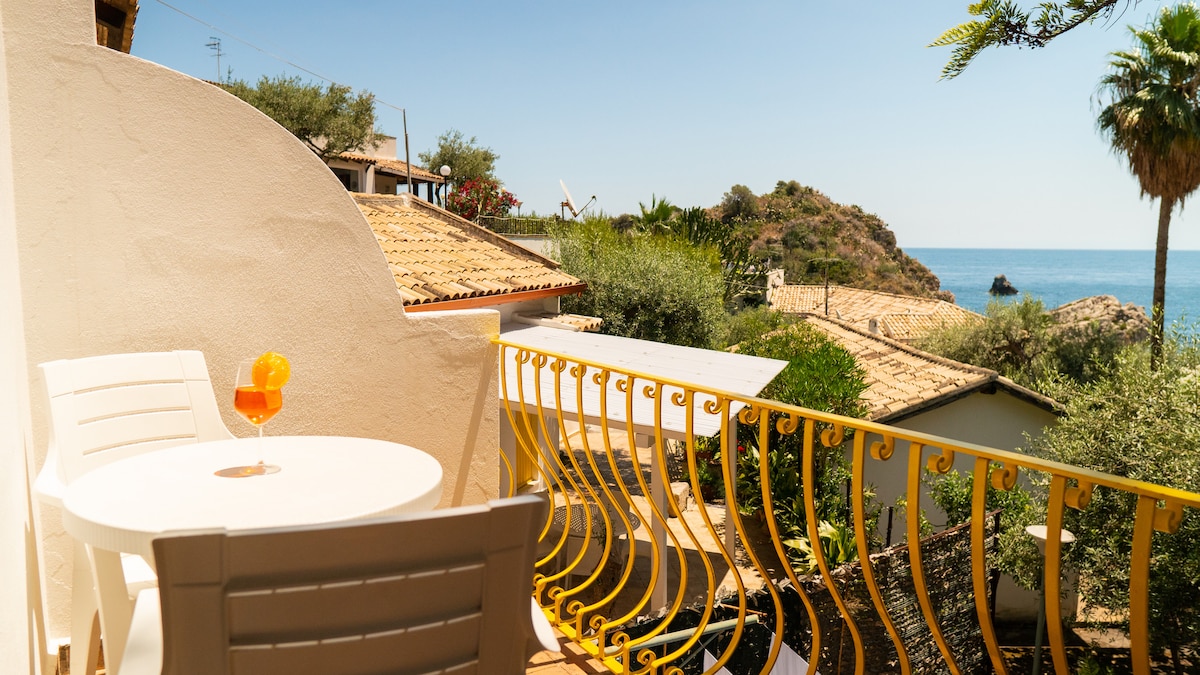 Bilocale fronte mare di 50 mq circa, situato sul lungomare della frazione di Mazzeo a 5 km da Taormina. E' arredato finemente con mobili di design moderno di alta qualità e suddiviso in cucina e living room con divano letto e camera da letto separata con letto matrimoniale e bagno. Dotato di angolo cottura attrezzato con utensili da cucina, lavatrice, lavastoviglie, aria condizionata e Tv a schermo piatto e ampio bagno. Terrazza di 45 mq fronte mare arredata con un tavolo e sedie e due lettini.