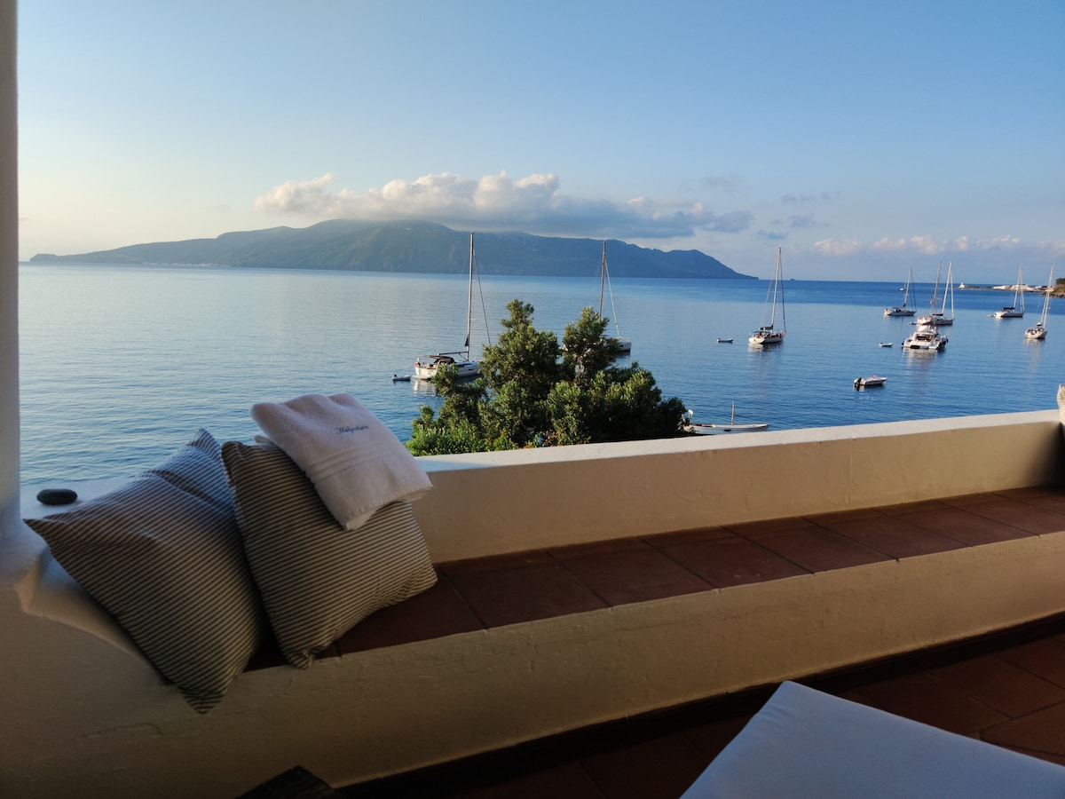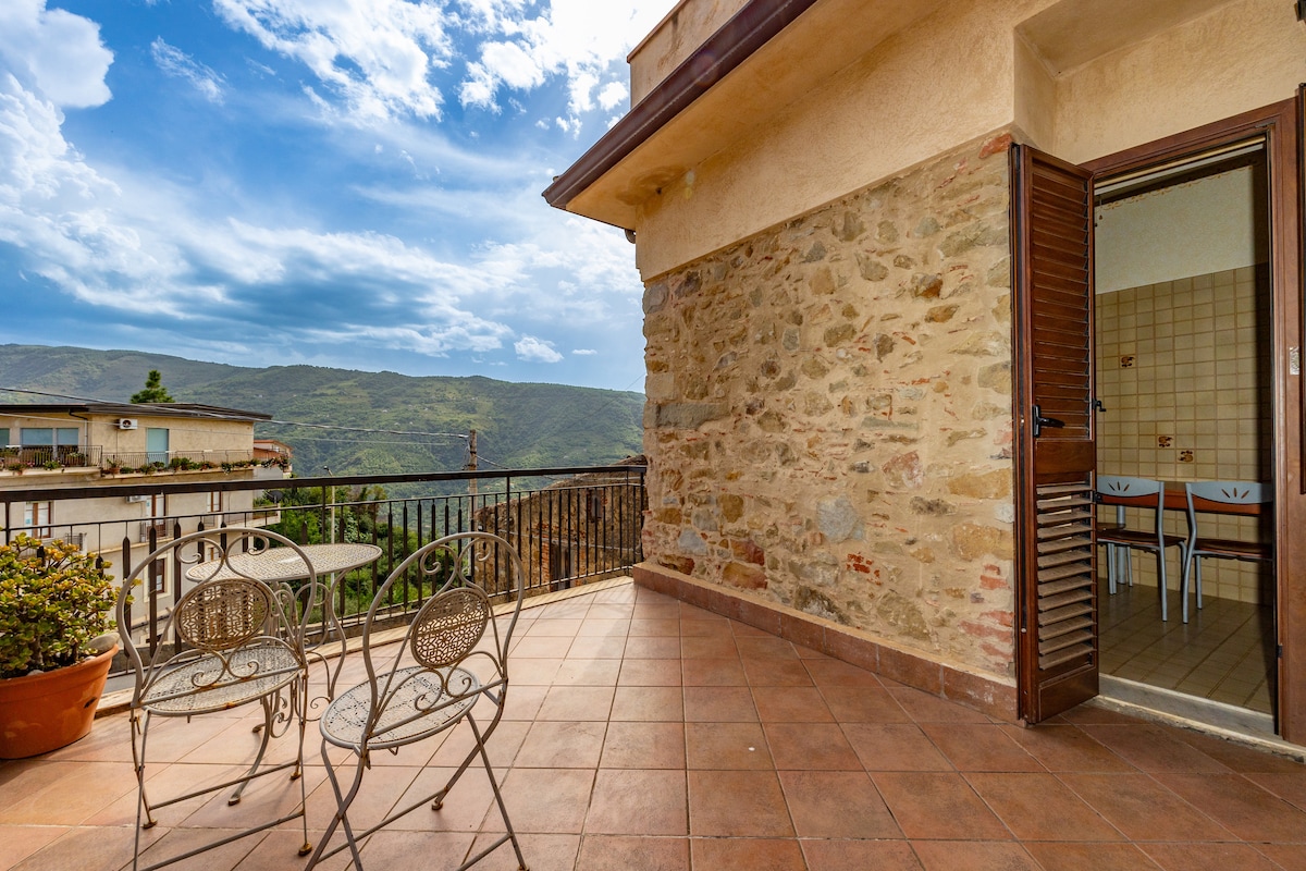 Escape to our beautiful private home, sea views, a romantic private terrace upstairs with table, chairs and a garden surrounded by trees and cactus. You will be staying in a house with a private dining area overlooking Giardini Naxos, and views of the hills of Taormina and Mount Etna. Our home is unique as our house is located in a peaceful position overlooking the whole of the coast from left to right. Wake up to the sound of birds and the sea breeze passing through our gigantic palm tree.