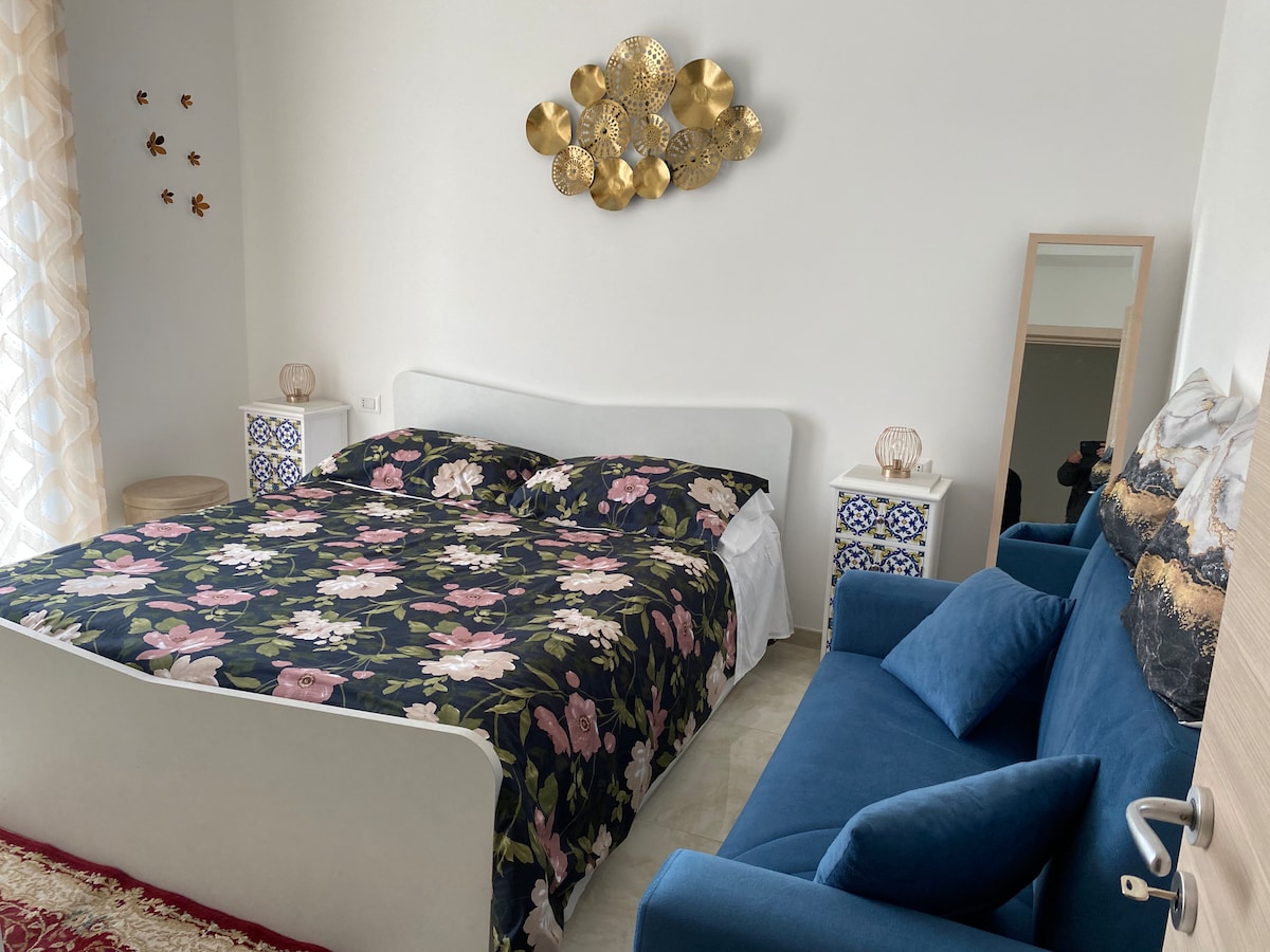 This apartment is the perfect apartment for a large number of people. It is a spacious 145 (website hidden). apartment with all rooms furnished to a high standard and with terrace doors that lead you either to the terrace of 60 sqm. All rooms are light and airy. It's approximate a 10 minute walk to the main street "Corso Umberto" and all the main amenities. The apartment has 3 fully furnished bedrooms (one twin bedroom and 2 double bed). Large lounge and dining area with table for 8 people with Hi Fi, TV, DVD player and satellite, Wi Fi connection and two bathrooms (both with bath). Large fully equipped kitchen with oven and grill, fridge and freezer, dishwasher, kettle, iron and washing machine. Air-conditioning in all bedrooms and lounge. Heating for the winter seasons. Suitable for children. Please contact us for further information. "Maggio" apartment is located in a residencial area on the ground floor with an amaizing sea view and a large terrace.