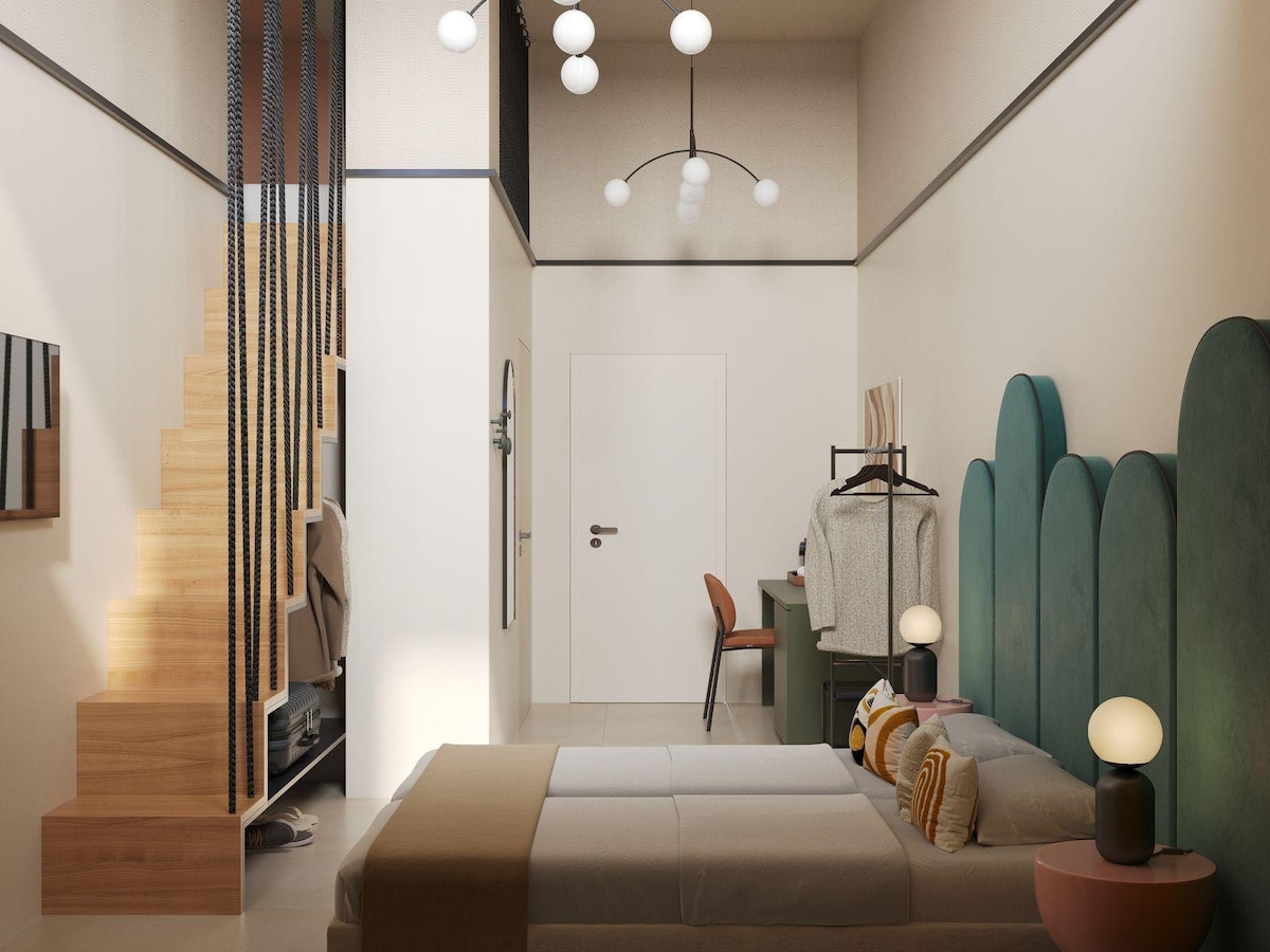 A harmonious blend of urban style and nature creates an atmosphere of elegance in this master bedroom suite. Equipped with a smart TV and desk for maximum comfort during your stay. The modern en-suite bathroom provides a relaxing environment. Brightness and ample space are the highlights of this room and create a cozy and pleasant atmosphere that will make your stay perfect. Access to the room requires the use of stairs