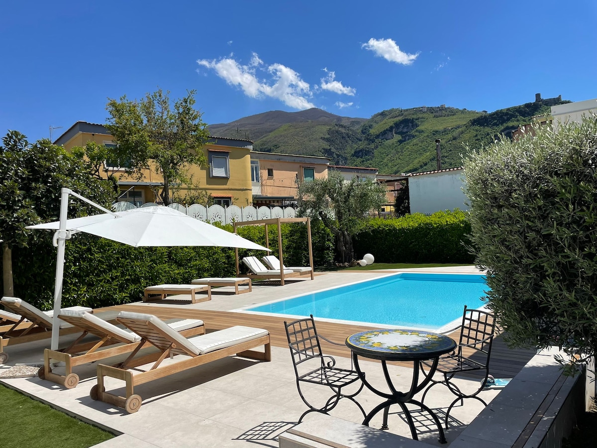 🏡 Villa ad uso esclusivo con vista mare sulla Costiera Sorrentina con piscina🏊♂️, con parcheggio gratuito in loco e ricarica per veicoli elettrici. 🌿 Giardino privato di 300 mq con cucina esterna e barbecue. 🛏 Interni confortevoli: 2 camere da letto (una con soggiorno), 2 cucine, Wi-Fi e aria condizionata. 🚆 Treno locale nelle vicinanze per Pompei, Napoli e Sorrento. 🛒 Supermercato a 100 m e ristoranti nel centro città (700 m).