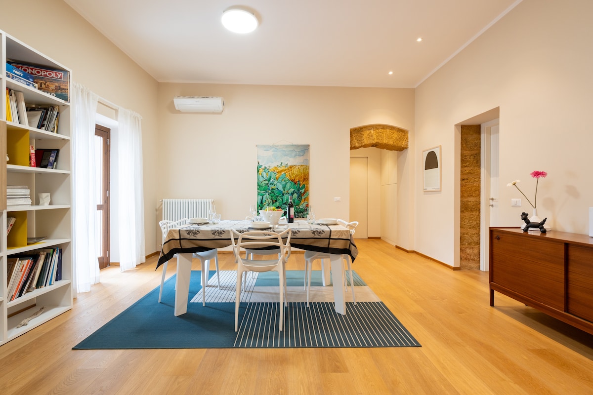 Appartamento sito in palazzo storico del 500, finemente arredato, con gusto vintage. E' costituita da due ampie camere da letto matrimoniali, e una cameretta con un comodo letto uso singolo. L' appartamento comprende anche una saletta per la colazione, un bagno in camera e un secondo bagno con doccia. Inoltre ha una porzione di una grande terrazza arredata, l'accesso esterno dalla scala principale del palazzo, posta al terzo piano per poter godere di una vista mozzafiato e del sole siciliano.
