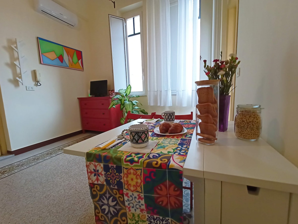 BENVENUTI Il Bilocale vi regalerà una totale privacy. È composto da: una stanza con con 1 letto matrimoniale, una cucina e bagno entrambi privati. Non appena usciti dal Bilocale avrete la possibilità di disporre di un confortevole living room e uno splendido terrazzo con tante piante che condividerete insieme agli altri ospiti. La palazzina, recentemente ristrutturata, è sita tra La Galleria d’arte Moderna e Piazza Rivoluzione con accesso a tutte le attrazioni locali!!