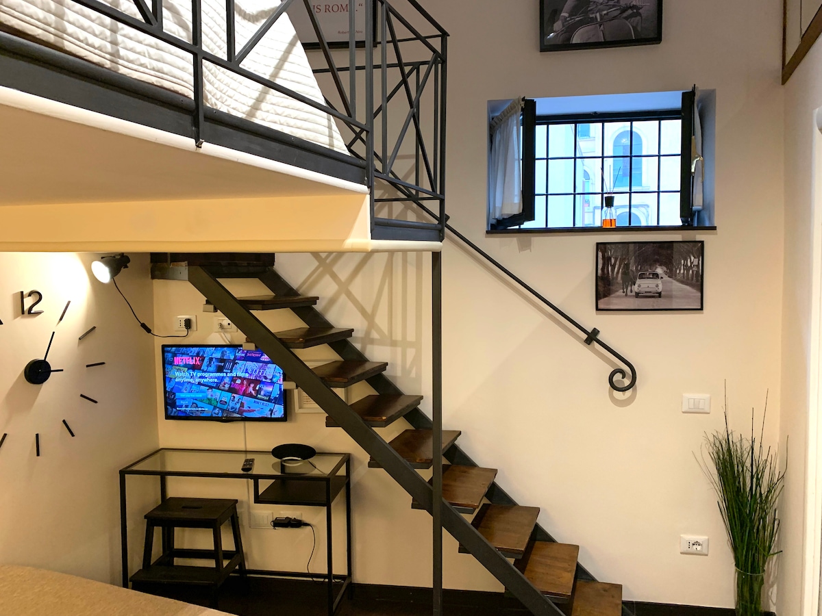 This bright and spacious loft apartment was recently entirely renovated. A wide window wall faces the Tiber river allowing a lot of sunlight to come in. There are beautiful Tuscan cotto floors and modern design furniture. There is a new fully equipped kitchen with a Nespresso coffee machine, air conditioning, heating system with adjustable temp, unlimited wi-fi, a washer/dryer, a bathroom with tub and shower. The flat sleeps four persons in a king size bed and a comfortable king size sofa bed