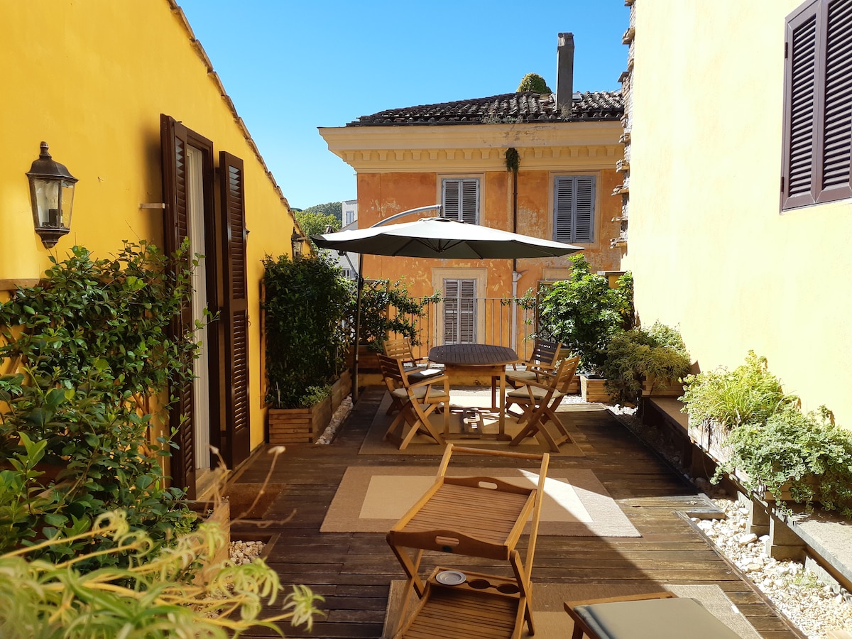 Bright and quiet penthouse apartment in the heart of Trastevere, with a wonderful terrace and an unparalleled view of charming roman roofs and the Gianicolo hill. The flat is meticulously refurbished and set in a picturesque cobblestoned street, just around the corner from the lively restaurants and cafes. La Casetta al Mattonato is located on the 3rd floor (41 steps, no elevator) of a 1600s typical roman building, within walking distance of all major attractions.