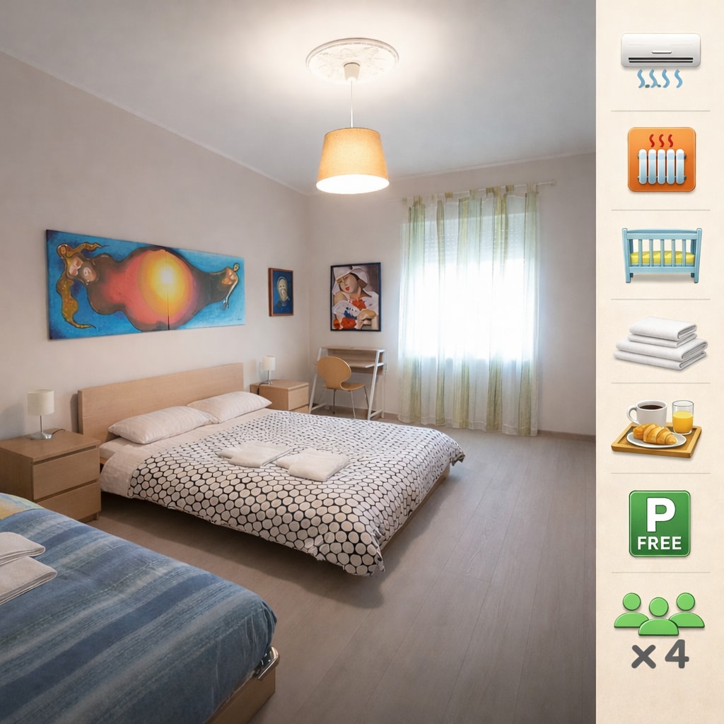 Ampio bilocale appena ristrutturato composto da camera da letto, cucina abitabile, ingresso e bagno. Accogliente ed elegante, l’alloggio è dotato di tutti in confort: smart TV 55 pollici e connessione fibra gratuita. Lavatrice disponibile per soggiorni lunghi. Letto singolo con rete pieghevole da posizionare nella camera matrimoniale. Disponibile lettino da campeggio completo di lenzuola e seggiolone. Alloggio sito al primo piano senza ascensore.
