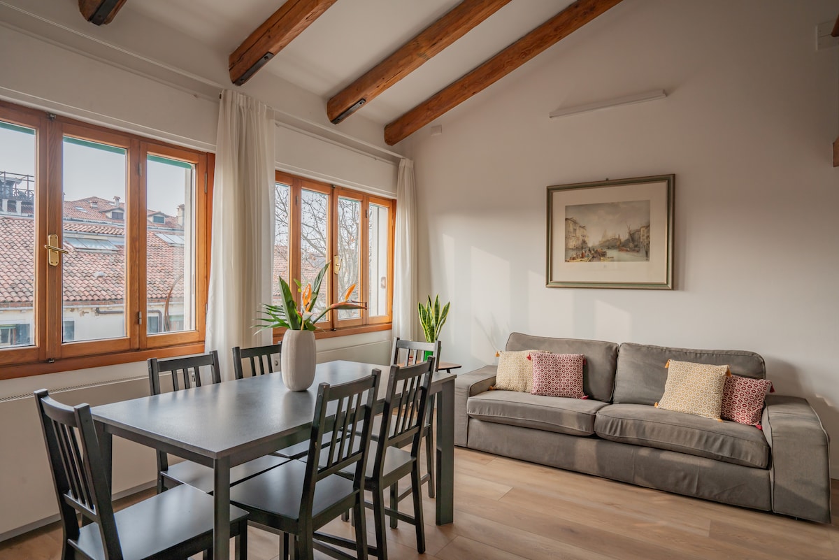 Goditi la magia di Venezia soggiornando in una casa rinnovata ma dall'antica eleganza veneziana. Casa terra-cielo, luminosa, silenziosa e arricchita da vivaci tocchi di colore, è l’ideale per una coppia. Puo' ospitare fino a 4 persone dato che vi è un comodo divano letto matrimoniale nel soggiorno ma attenzione che il bagno si trova al piano superiore e per accedervi bisogna passare davanti alla camera da letto open space.