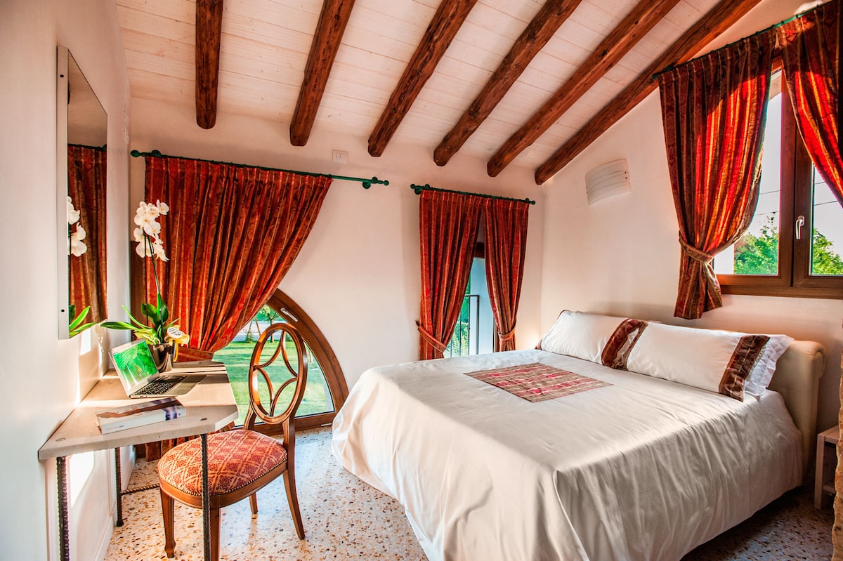 Set in the Brenta River, in a strategic point near Venice, Padua and Treviso. Comfortable and refined country house with large garden& private parking. Ideal for large groups. High quality interior: floor in Tuscan Terracotta, oak wood, roof in larch, furniture in cherry, oak and walnut solid wood. Bathroom in glass mosaic .A perferct mix of Venetian&Tuscan Style. Free Wifi. Large park with fenced parking.