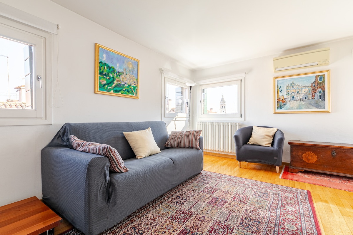 Moreover, a fine terrace offering a breathtaking view over the roofs and a glimpse of the Grand Canal - situated just 100 m from the flat - completes the space and creates the perfect place for relaxing or romantic dinners under the stars.