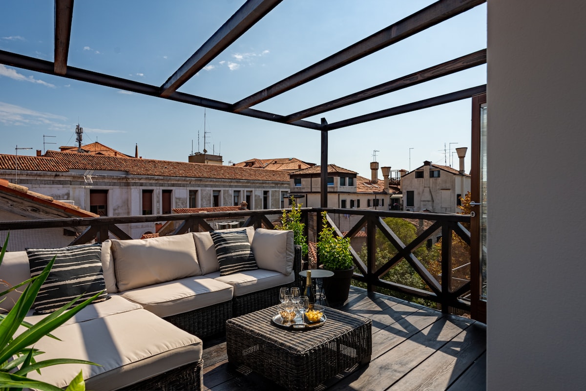 Dolfin Terrace apartment is unique for multiple factors that will make our guests' stay extremely pleasant and unforgettable. It is located in Dorsoduro, in a comfortable and authentic area of Venice. It develops over 4 floors, one of which is dedicated to the Altana (Venetian terrace) from which you can enjoy a breathtaking view. There is a large living room with design kitchen, 3 bathrooms (2 insuite), 2 bedrooms and another small living room just before the terrace. COD.027042-loc-12141