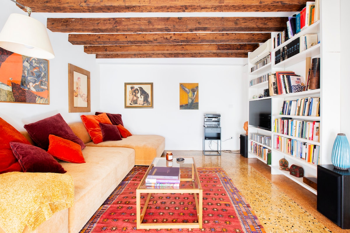 Admire the beauty of Venice from the arched windows of this welcoming and spacious apartment which combines historical elements, such as wooden beams, and contemporary furnishings. From the large windows you can enjoy a beautiful view of the canal, crossed by gondolas, and of the typical Gothic buildings of Dorsoduro, the most authentic district of Venice, appreciated by artists and intellectuals of all ages; equipped with two bathrooms and every comfort, you will find books and art objects.